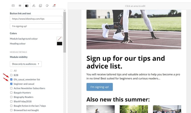 The module will be shown or hidden based on the customer belonging to a saved audience from the list. Several audiences can be ticked at once, so your content can of course be shown or hidden to several groups at once.