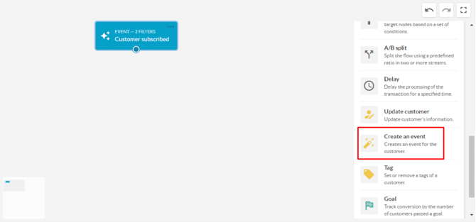 The first node is edited. Click “OK”. We can now select the next node for the path, which in this case will be “Create an event”. This event will be the trigger for the actual email sending in Custobar: