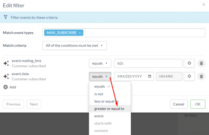 To define the time window for the event MAIL_SUBSCRIBE click “Add”, choose the subscribed event, then look for the date event and select “greater or equal to” from the dropdown. This means that we do not trigger the path for old events: