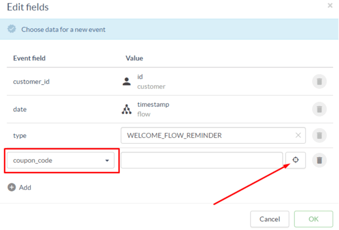 In the reminder event for the customers that did not purchase, we include the same code that the customer got in the initial welcome email. To do this, click on “Add” and select the coupon code from the previous automated campaign event to fetch the same code: