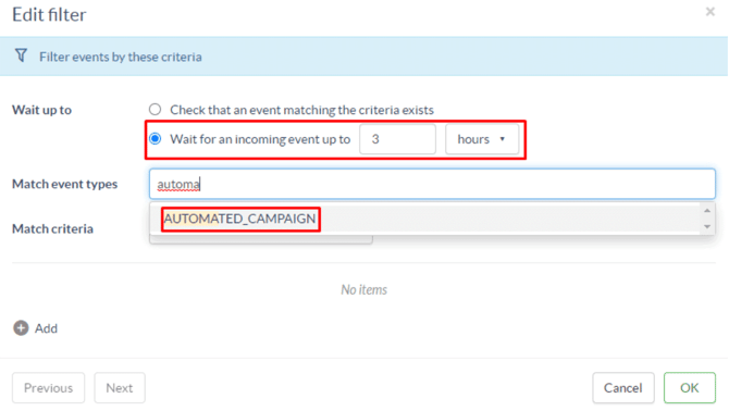Now we can set this node to wait for the AUTOMATED_CAMPAIGN event for a specified time, for example 3 hours to find the events. Then select the AUTOMATED_CAMPAIGN event on “Match event types” field and then click “OK”.